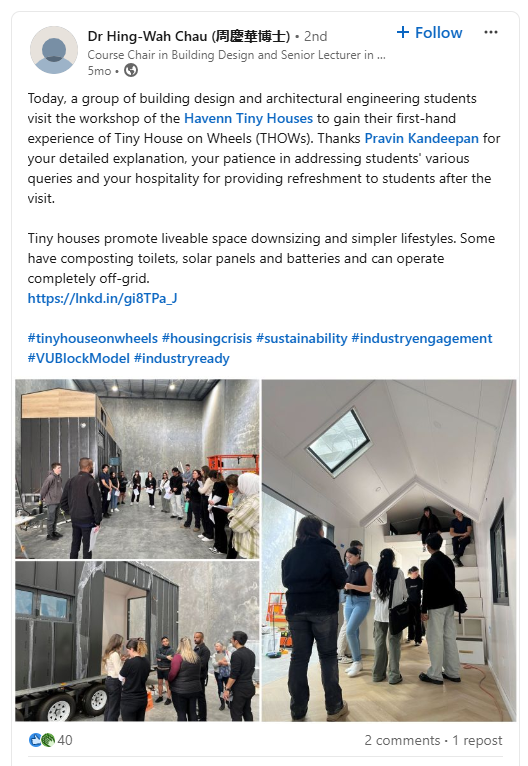 "Today, a group of building design and architectural engineering students visit the workshop of the Havenn Tiny Houses to gain their first-hand experience of Tiny House on Wheels (THOWs). Thanks Pravin Kandeepan for your detailed explanation, your patience in addressing students' various queries and your hospitality for providing refreshment to students after the visit.